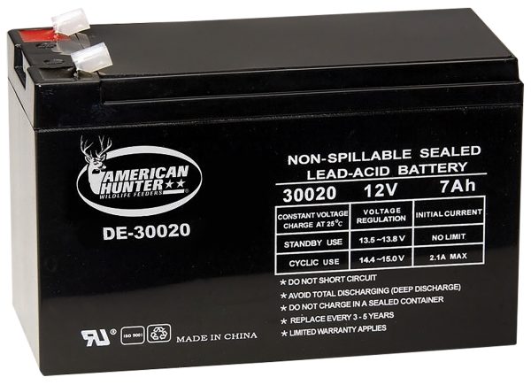 American Hunter’s HR Rechargeable Battery is commonly used for game feeders, headlights, back-up lights, and household alarms. It is rate at 12 volts, 7 AMP and a tap top.