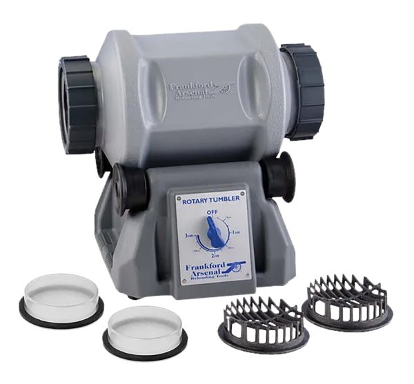 The Platinum Series Rotary Tumbler delivers a new level of brass cleaning performance. Its rotary tumbling with stainless steel media in a liquid bath gets brass much cleaner, and works much faster than ultrasonic or vibratory tumbling methods. The small stainless pins easily penetrate inside cases and into primer pockets to deliver unbeatable cleaning power. The large volume drum holds up to 1000 pieces of .223 brass and has a molded in rubber lining to protect brass and dampen noise during operation. A built in timer in the base can be set to run from 0 to 3 hours, shutting off automatically. A set of sifting end caps is also included to assist in separating the stainless media once tumbling is complete. Five pounds of 304 stainless media pins and a sample packet of Frankford Brass Cleaning Solution are included.