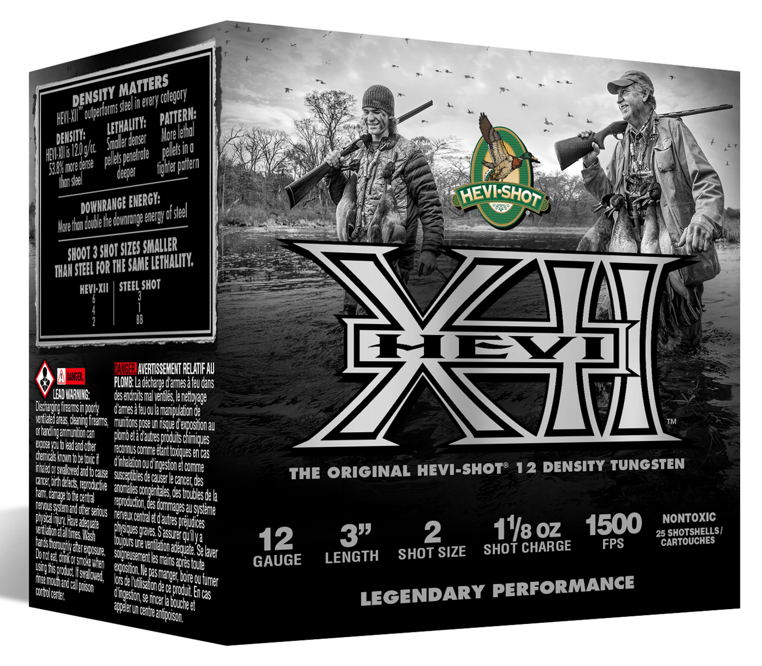 HEVI-XII is 53.8% more dense than steel, which translates to double the downrange energy. This allows you to drop down 3 shot sizes for the same lethality. It also gives you 28% more devastating pellets on target. More kills. Fewer Cripples. Better Stories. Pack in with HEVI-XII and walk out carrying extra weight.