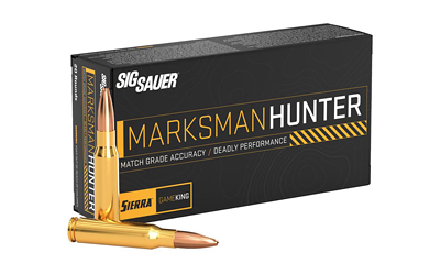 The Sig Sauer Marksman Hunter line of ammunition was designed with the practical hunter in mind. Precision-loaded for competition-level accuracy at long range, these rounds will be your reliable companion in the field. The boat tail design reduces drag, ensuring a flatter trajectory and less wind drift – for those moments when precision really counts. Each bullet features a thick jacket for consistent performance on medium game, with a skived bullet nose to ensure consistent expansion, delivering the power you need.